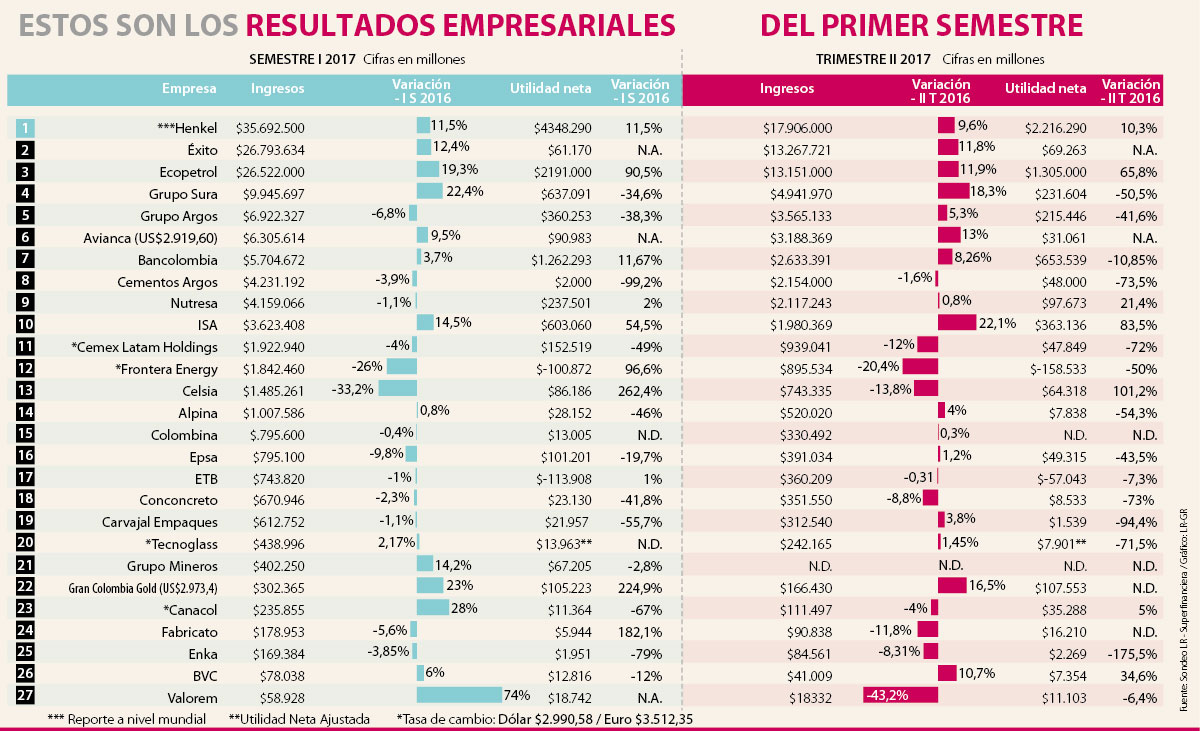 Sin embargo, dos grandes holdings ocuparon los siguientes lugares. El Grupo Sura hizo lo propio con ingresos por $9,9 billones, un crecimiento de 22,4% y el registro de utilidades más alto del conjunto: $637.091 millones. Mientras que Grupo Argos tuvo un crecimiento de 22,4% y se destacó con una cifra de $6,9 billones en ingresos pese a tener 6,8% menos en ventas que el primer semestre de 2016.