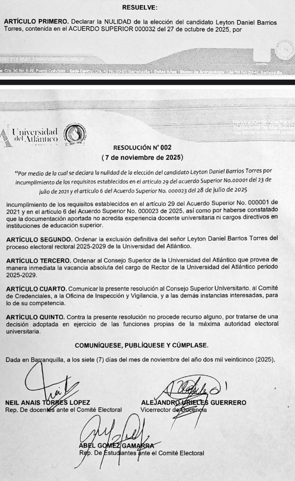 Además, y en relación a la resolución expedida por el Comité Electoral, la Universidad aseguró que "la Oficina Jurídica de la Universidad del Atlántico presentó denuncia penal ante la Fiscalía General de la Nación por la posible comisión de los delitos de prevaricato por acción y usurpación de funciones públicas, en relación con la resolución recientemente suscrita por algunas personas que se identificaron como miembros del Comité Electoral".