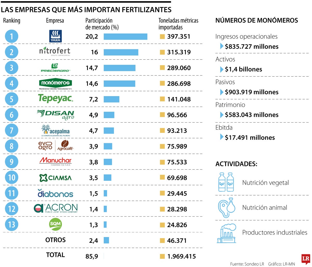 Las importaciones de fertilizantes durante el año anterior fueron lideradas por la noruega Yara, con una participación de 20,2% y unas 397.351 toneladas métricas (TM); seguida por Nitrofert, con 16% y 315.319 TM; Precisagro, con 14,7% y 289.060 TM; Monómeros + Ecofertil, con 14,6% y 286.698 TM; y Nutrición de Plantas, del corporativo mexicano Tepeyac, con 7,2% y 141.048 TM.