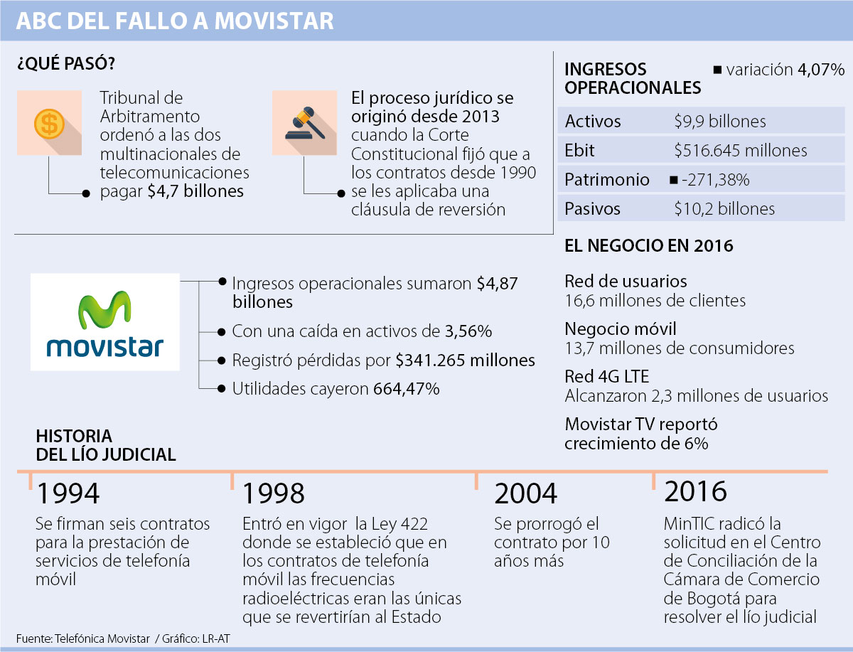 Pero después de estos resultados en los que presentaron pérdidas por $341.265 millones, la organización está nuevamente en una encrucijada por decidir cómo pagar un fallo por $1,6 billones otorgado después de una demanda interpuesta por el Ministerio de las Tecnologías de la Información y las Comunicaciones (MinTIC), y aprobada por el Tribunal de Arbitramento a las multinacionales Claro y Movistar por un total de $4,7 billones, lo que representa una tercera parte de los ingresos de las compañías en 2016 ($16,1 billones).