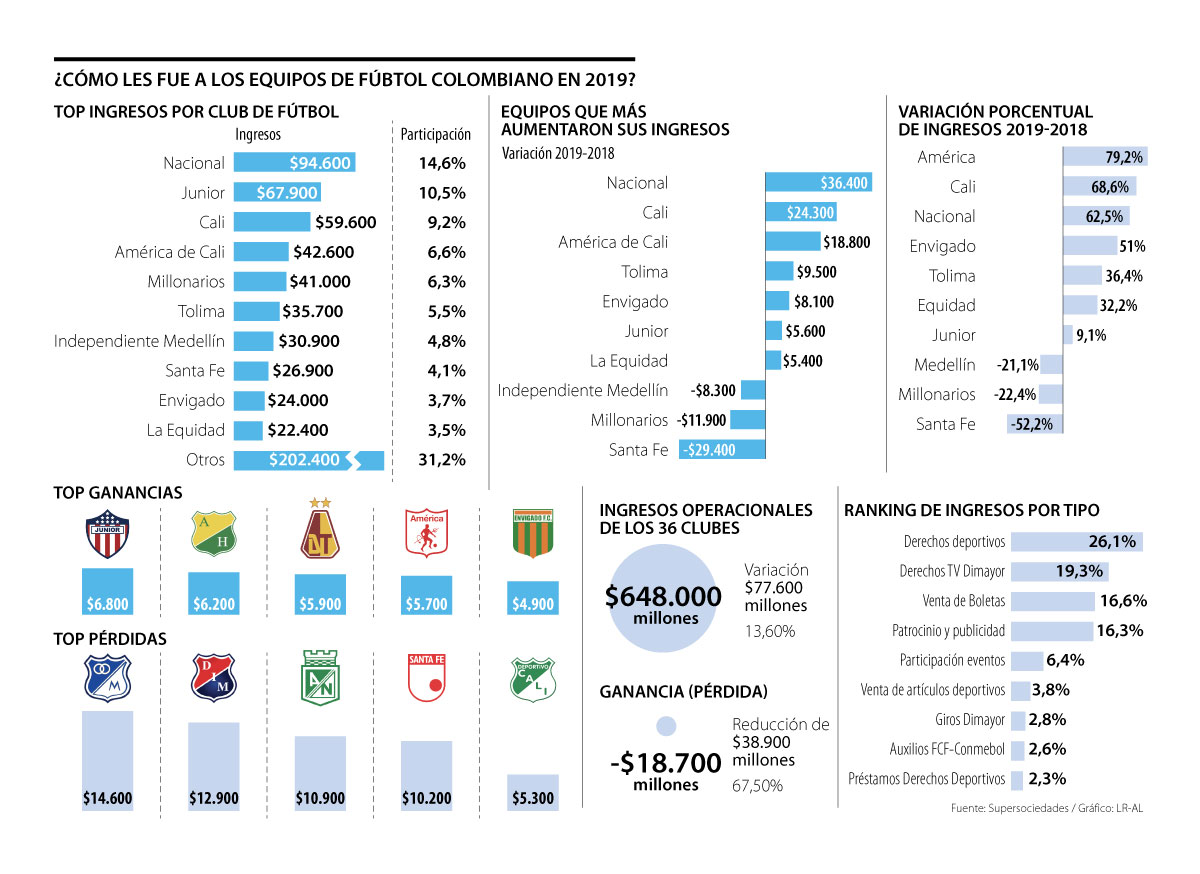 La buena noticia estuvo acompañada con el informe sobre el comportamiento financiero de los 36 clubes de fútbol colombiano durante 2019 que presentó la Superintendencia de Sociedades. En este se destacó que los ingresos operacionales de los equipos ascendieron a $648.000 millones, es decir, 13,6% ($77.600 millones más) que en 2018. Sin embargo, el aumento en ingresos no alcanzó para dar utilidad.