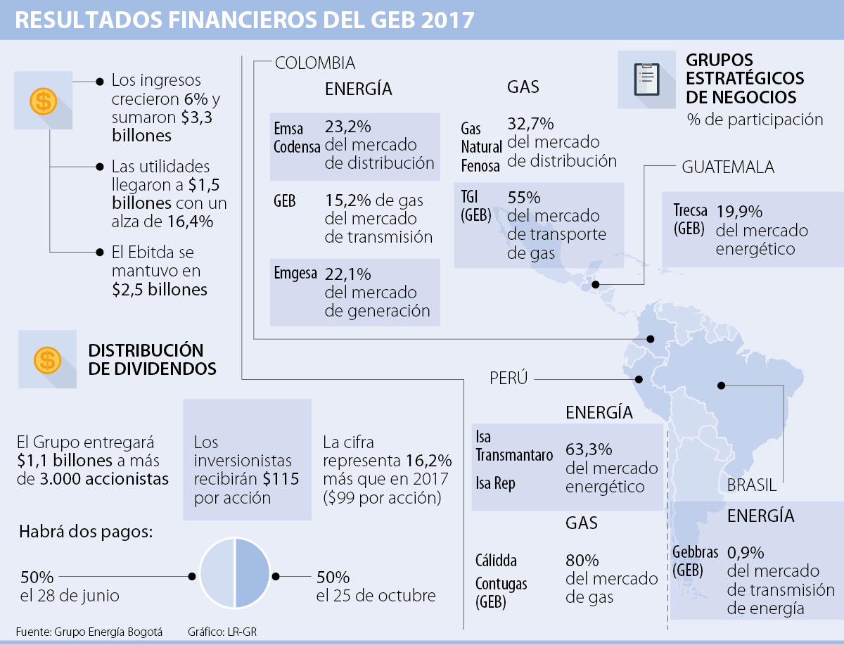 Tras ser una de las empresas protagonistas de las 15 transacciones más importantes de 2017, con una inversión de US$1.300 millones en la consolidación de su operación en Colombia, Perú, Guatemala y Brasil hasta 2018, el Grupo Energía Bogotá (GEB), confirmó que los negocios de distribución y transporte de gas natural, impulsaron sus resultados al cierre del año pasado.