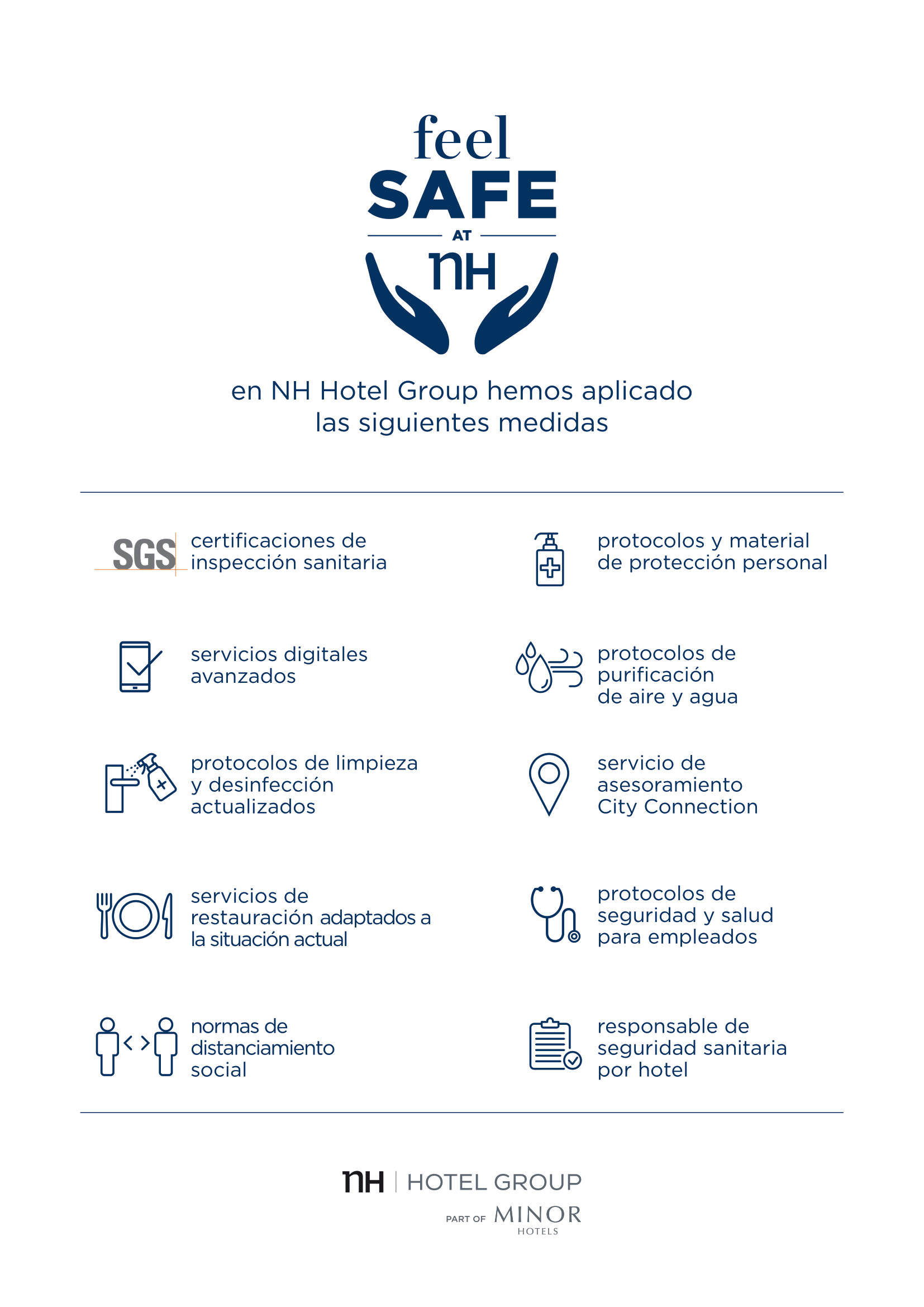 Avaladas por expertos, estas medidas se implementarán en cada una de las 364 propiedades del Grupo. Feel Safe at NH revisa toda la operativa de la Compañía y concentra todas las iniciativas bajo 10 líneas de acción, que dan respuesta a las necesidades de los viajeros en la nueva realidad social provocada por covid-19.