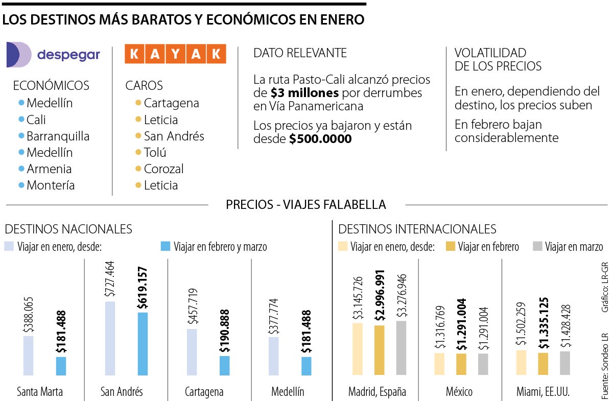 “Para el mes de enero, los costos en tiquetes aéreos, según el destino, tienen precios más elevados, pues aún es temporada alta. Sin embargo, para los meses de febrero y marzo, los costos en tiquetes aéreos se reducen notoriamente”, explicó Dirk Zandee, vicepresidente de Despegar y Viajes Falabella Andinos.