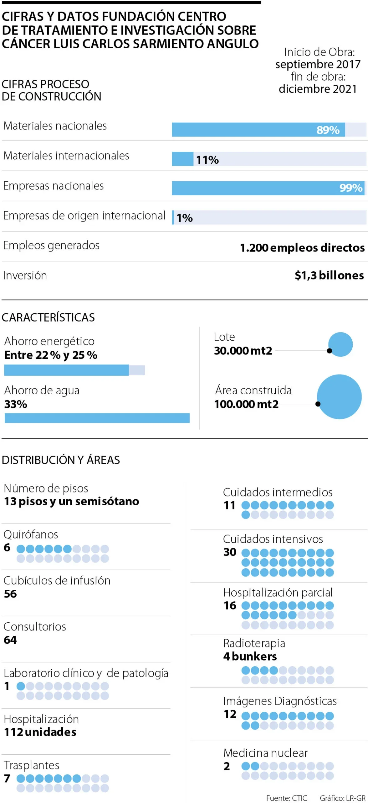 La capacidad de atención médica de alta complejidad de Colombia recibirá hoy un impulso, cuando abra sus puertas el nuevo Centro de Tratamiento e Investigación sobre Cáncer Luis Carlos Sarmiento Angulo (Ctic), gracias a una inversión de $1,3 billones. Entre otras cosas sumará más de 176 nuevas habitaciones, iluminadas con luz natural.