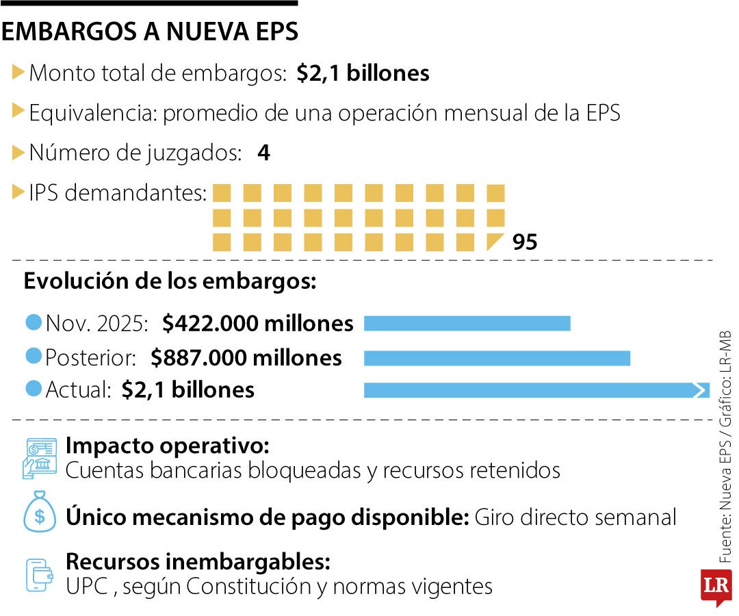 Nueva EPS informó que actualmente enfrenta embargos judiciales por un valor superior a $2,1 billones, ordenados por cuatro juzgados del país. Según la entidad, esta cifra equivale al promedio de la operación mensual y corresponde a recursos que permanecen retenidos en diferentes cuentas y fuentes de financiación, en el marco de procesos judiciales en curso.