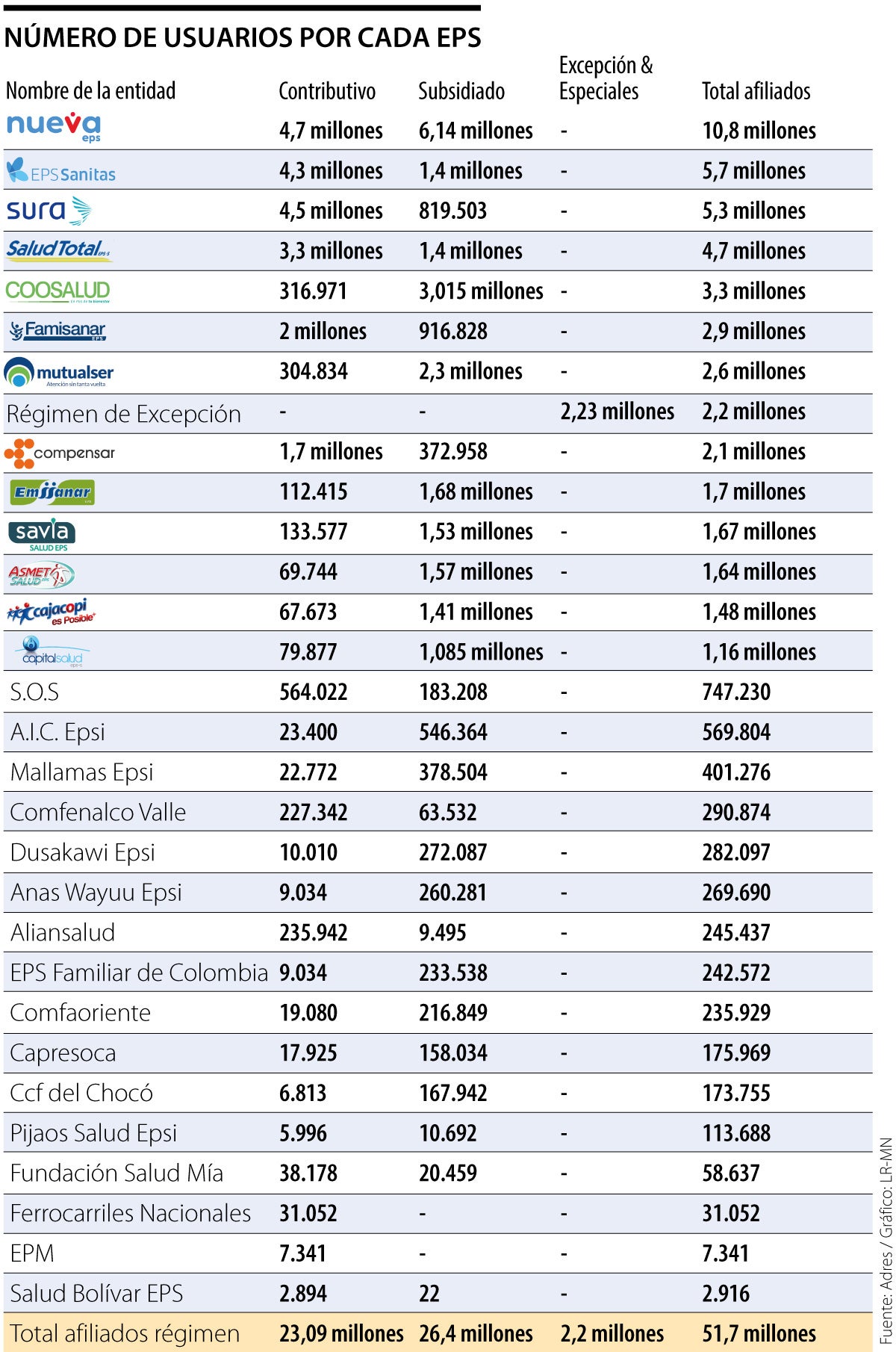 El país cuenta con un total de 51,7 millones de afiliados, según la información de la Administradora de los Recursos del Sistema General de Seguridad Social en Salud, Adres. De este total, 23,09 millones pertenecen al régimen contributivo; 26,4 millones, al subsidiado. Asimismo, las personas que pertenecen a la categoría "excepción y especiales" se cuentan en 2,2 millones.