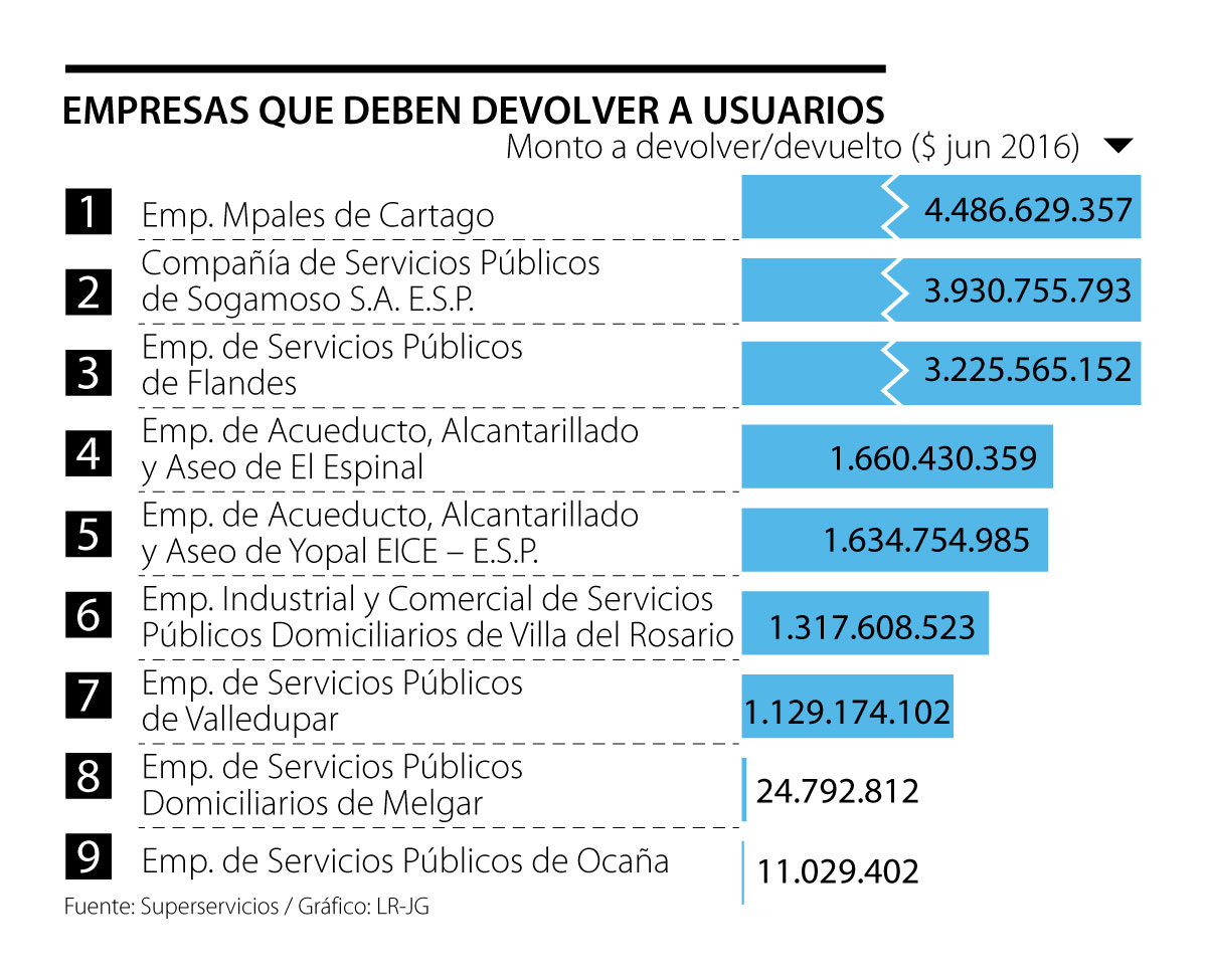 Las tres empresas prestadoras del servicio que más deben devolver son: Empresas Municipales de Cartago, la Compañía de Servicios Públicos de Sogamoso, y la Empresa de Servicios Públicos de Flandes.