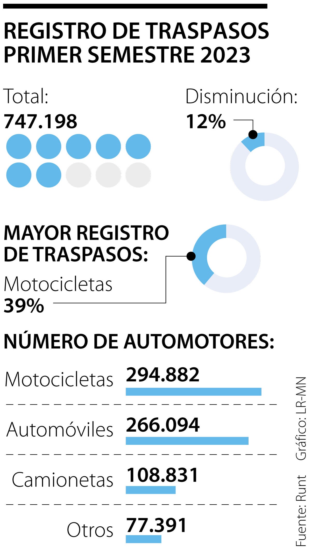 De acuerdo con la organización que mide estos trámites, a nivel nacional se registraron 747.198 traspasos, 294.882 fueron de motocicletas, 266.094 corresponden a automóviles, 108.831 son camionetas y otras clases como camiones, motocarro, tractocamión, bus, buseta y volqueta equivalieron a 77.391. Esto da un total de 747.391.