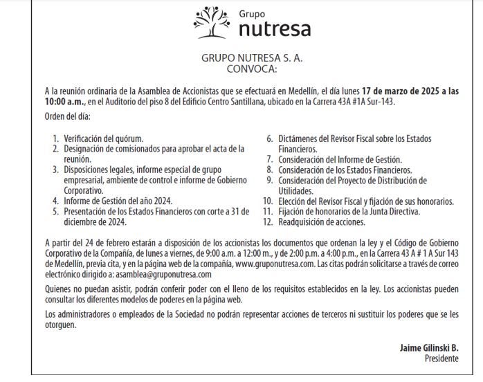 Grupo Nutresa ya convocó a la Asamblea General de Accionistas para el 17 de marzo; allí se presentará el balance del ejercicio en 2024 y el orden del día contempla 12 puntos, entre los que se incluye "readquisición de acciones".