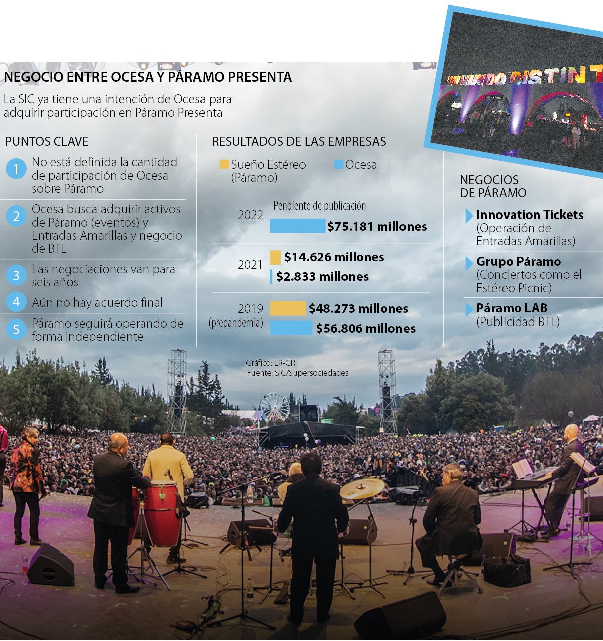 Hoy, ambas son competidoras en el negocio de los shows en vivo, pero en la Superintendencia de Industria y Comercio (SIC) hay una carta en la que Ocesa Colombia manifiesta su intención de adquirir participación. Aunque el documento no lo especifica, fuentes dijeron a LR que se trata de un porcentaje mayoritario. El documento habla de una integración, lo que no quiere decir que Páramo desaparezca. De hecho, pasaría lo mismo que Ocesa ya vivió.