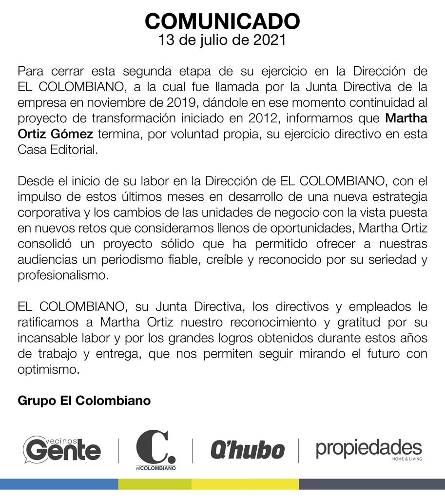 Martha Ortiz Gómez, directora de El Colombiano, se retirará del periódico. Así lo informó un comunicado de la casa editorial, en el que señala que "desde el inicio de su labor en la dirección de El Colombiano, con el impulso de estos últimos meses en desarrollo de una nueva estrategia corporativa y los cambios de las unidades de negocio con la vista puesta en nuevos retos que consideramos llenos de oportunidades, Martha Ortiz consolidó un proyecto sólido que ha permitido ofrecer a nuestras audiencias un periodismo fiable, creíble y reconocido por su seriedad y profesionalismo".