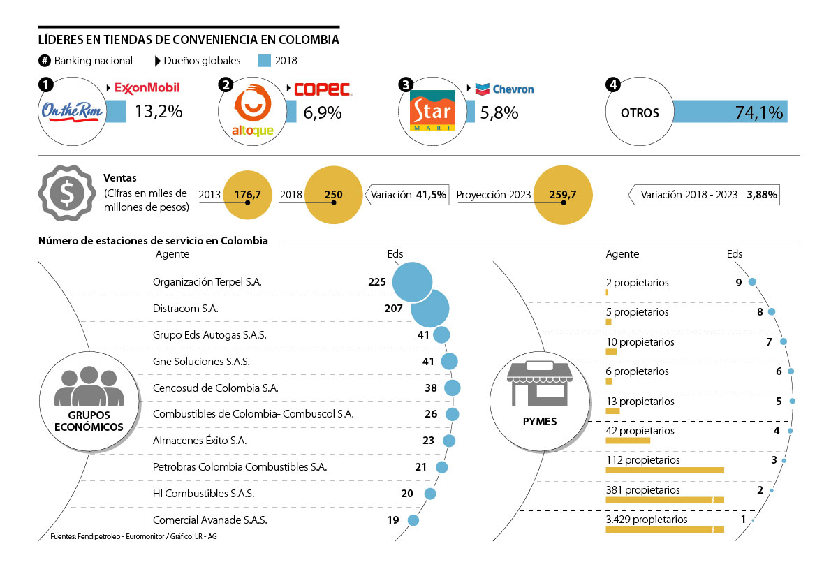 En Colombia el líder en número de estaciones de servicio de gasolina es Terpel con 225 locales, sin embargo, la empresa no se queda con el liderato en las tiendas de conveniencia, ya que este puesto es para Esso Mobil, que con sus puntos On the Run logró una participación de 13,2% en 2018. A la empresa le sigue Copec, distribuidor de Terpel, que está en segundo lugar con las tiendas Altoque, y en tercer puesto está Chevron con las tiendas de Star Mart.