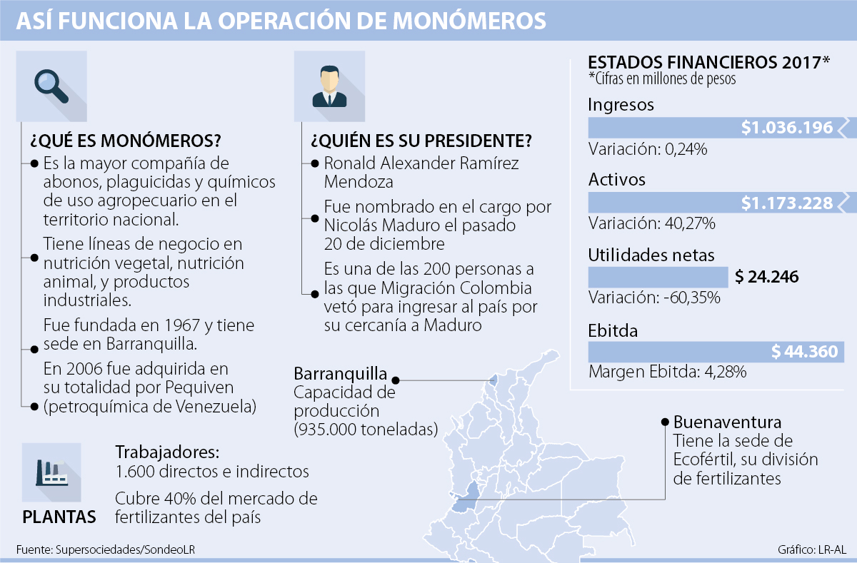 Monómeros Colombo Venezolanos S.A., es una de las compañías líderes de fertilizantes, plaguicidas y químicos de uso agropecuario con más de 50 años en el país y pertenece a la Petroquímica de Venezuela. Su capacidad total de producción es de 935.000 toneladas y genera más de 1.600 empleos directos e indirectos en Colombia.
