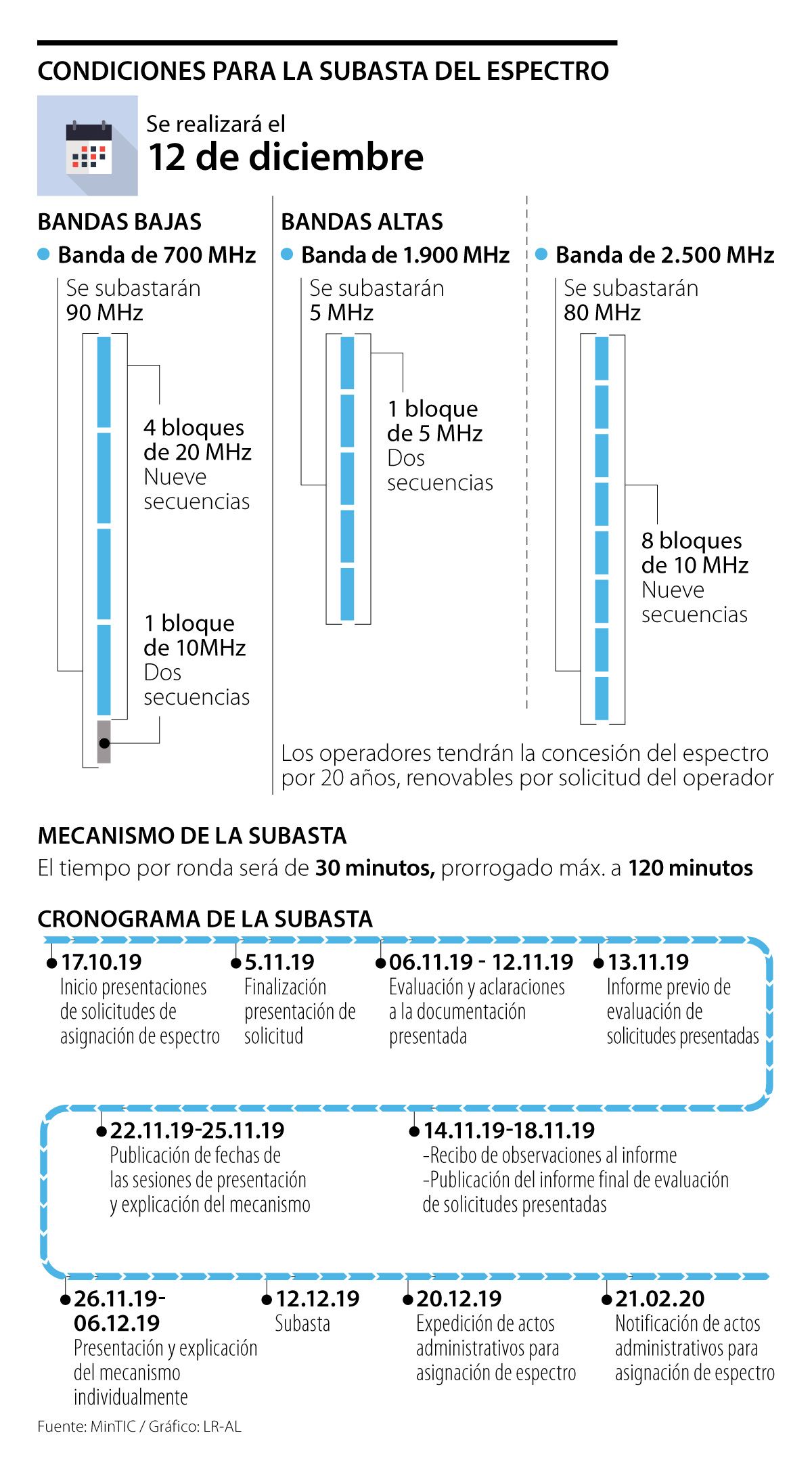 Mantilla explicó que el proceso cuenta con diversas garantías para las dos partes, entre las que están la de seriedad de la oferta, que se debe anexar a la solicitud de participación, presentada hasta el 5 de noviembre, así como la de cumplimiento para el permiso del uso del espectro, que se presenta 20 días calendario después de la asignación del espectro.