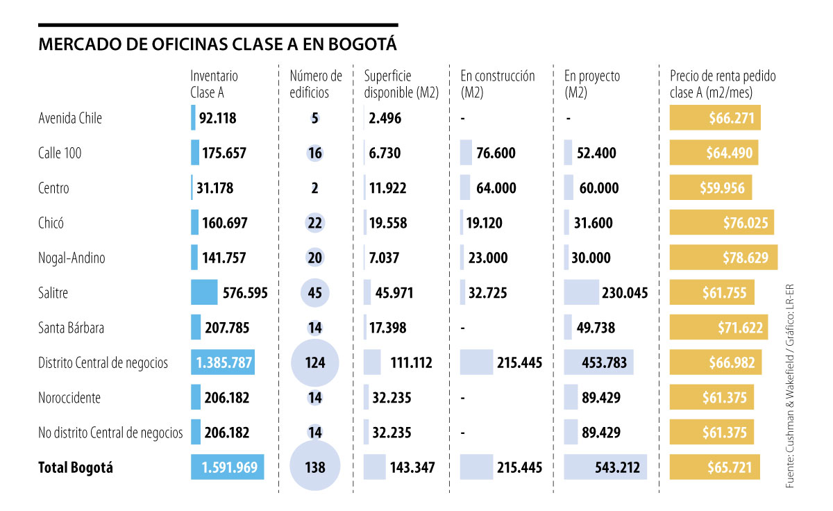 De estos proyectos, 42% del área se localiza en Salitre y podrían sumar 230.000m2 al inventario con el que se cuenta actualmente en esta zona; 16%, que representa cerca de 89.429 metros cuadrados, está en zonas que no pertenecen al distrito central de negocios en el Noroccidente. También se tienen planeados proyectos como las Torres de Unicentro, la segunda torre de Atrio, Connecta80 y los planes que se tienen para Proscenio y Plaza Chicó.