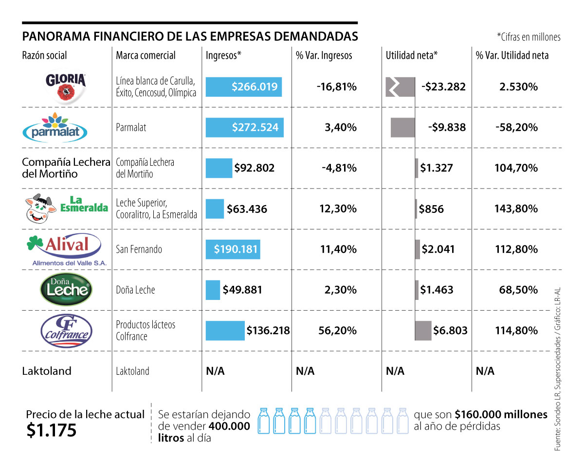 Dentro del documento que el accionante de la denuncia dio a conocer, se demanda a nueve empresas que, según la acción judicial, contienen en sus productos lactosueros, y no 100% leche. Entre las más reconocidas están Grupo Gloria, Parmalat y San Fernando.