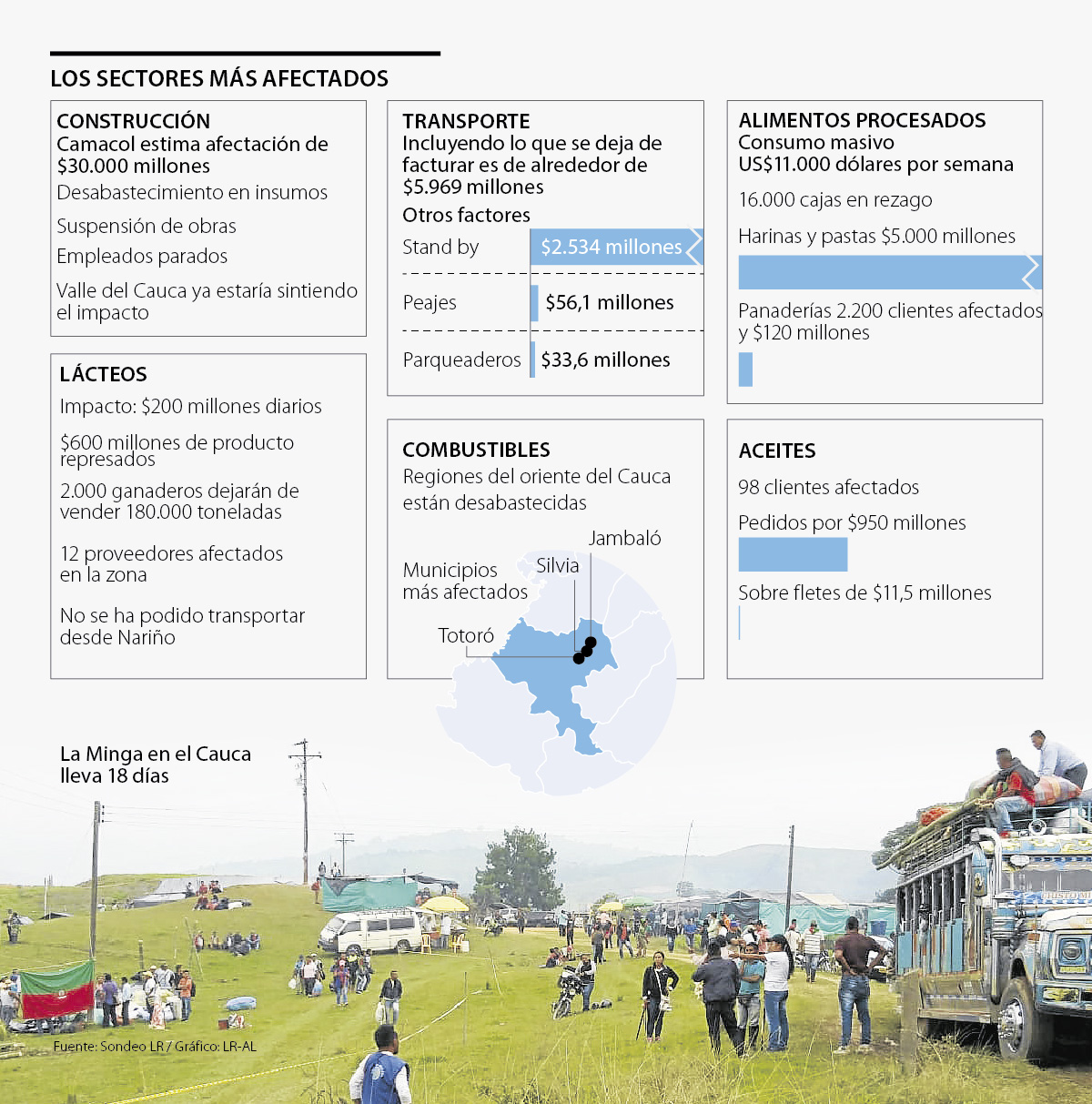 Tras 18 días de la minga indígena, varios sectores económicos ya empezaron a sentir los estragos de los bloqueos que se han presentado en el departamento del Cauca y Huila, los cuales podrían estar por encima de los $40.000 millones, según cálculos elaborados a partir de reportes empresariales.