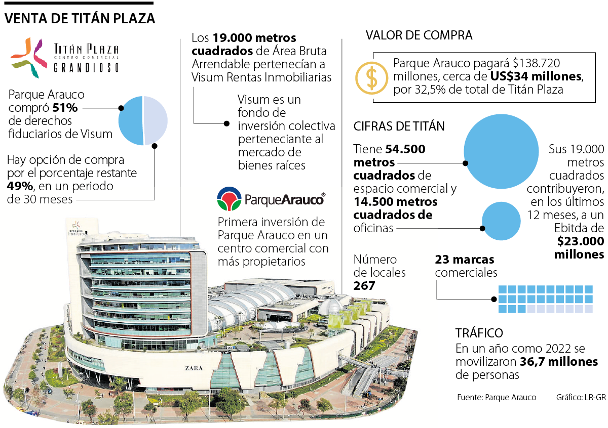 La movida de la filial chilena en Colombia generó la compra de 51% de la participación que tenía Visum Rentas Inmobiliaria, uno de los socios de Titán Plaza, lo cual representa para Parque Arauco comprar 32,5% total del complejo de ocio. Visum Rentas Inmobiliarias poseía 19.000 metros cuadrados de área bruta arrendable.
