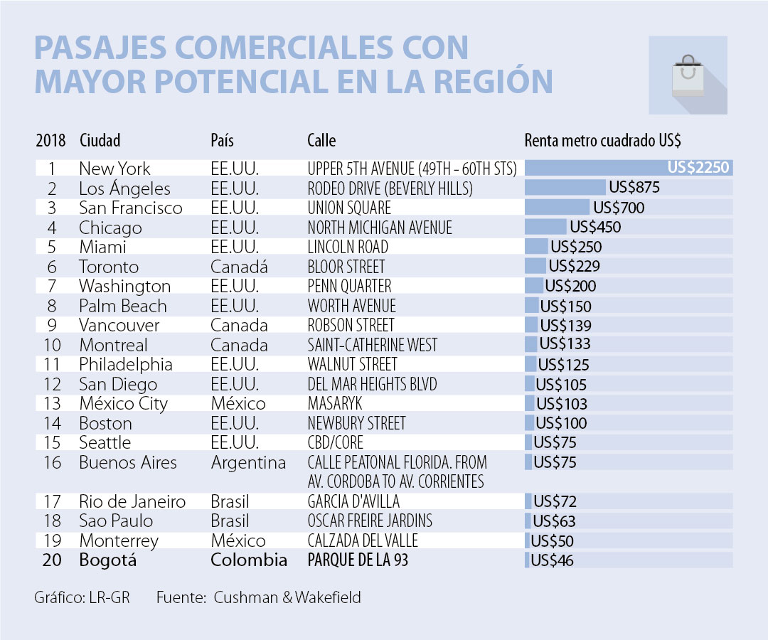 En esta ocasión, Colombia aparece en el top 20 de las calles comerciales más costosas de América, con el Parque de la 93, donde el promedio de arrendamiento es de US$46 por metro cuadrado al mes, según el mismo informe.