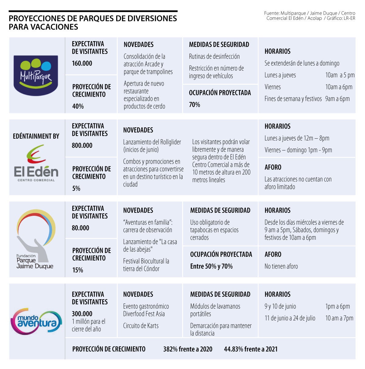 “Para la temporada de vacaciones de junio y julio esperamos recibir más de 160.000 visitantes al tener habilitados todos los días para servicio al publico. Para 2022 esperamos retomar los niveles de ingresos prepandemia representando un crecimiento frente a 2021 superior a 40%”, dijo Constanza Arango, Gerente de Multiparque.