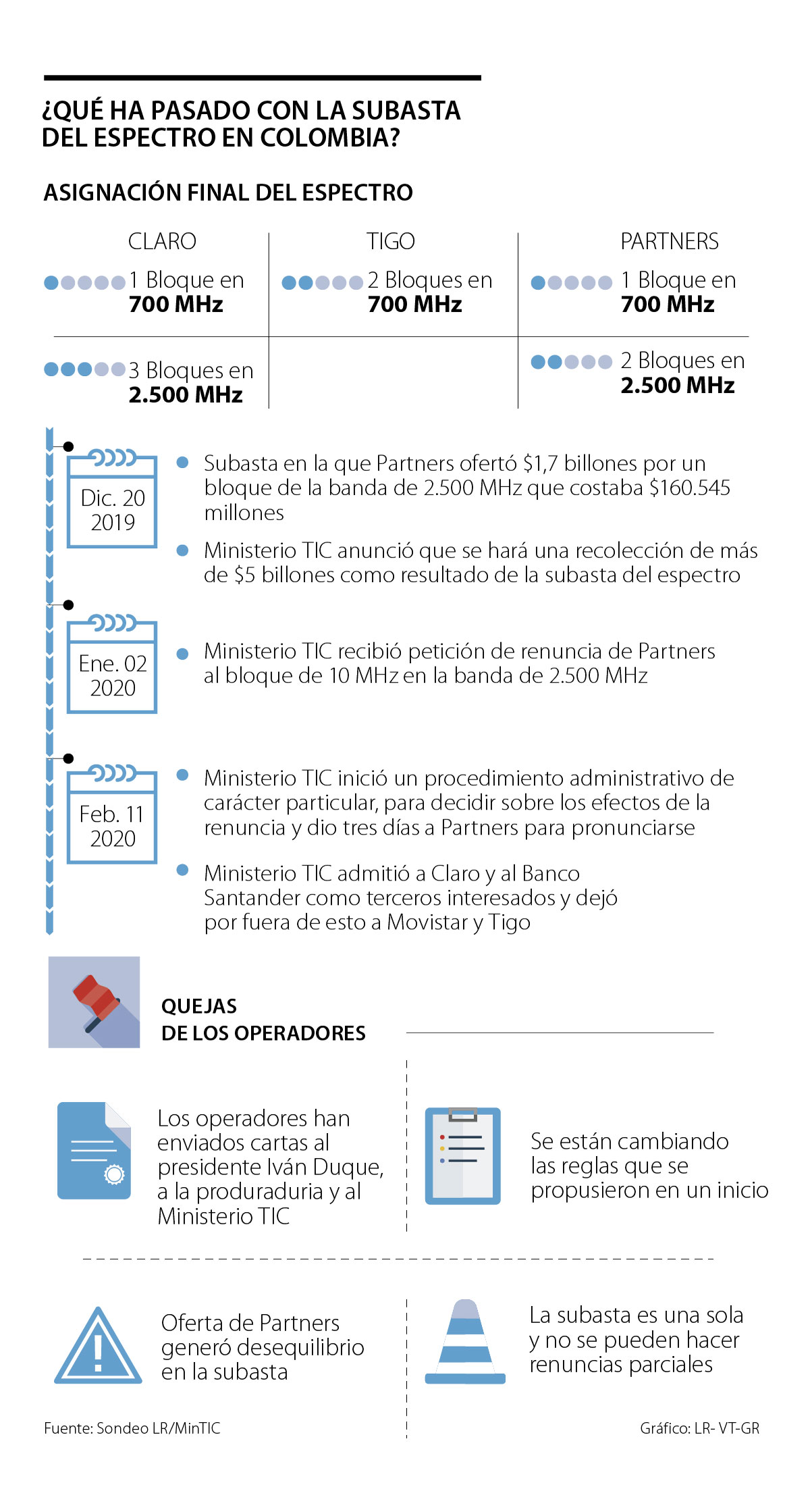 Lo que sería uno de los procesos más importantes para el país y para el sector de las telecomunicaciones, se convirtió en una disputa entre las compañías participantes. Esto se debe a la petición de Partners, que finalmente fue aceptada, de renunciar al bloque en la banda de 2.500 MHz por el que ofertó $1,7 billones el pasado 20 de diciembre, un valor que es cerca de 10 veces el precio inicialmente previsto por ese bloque.