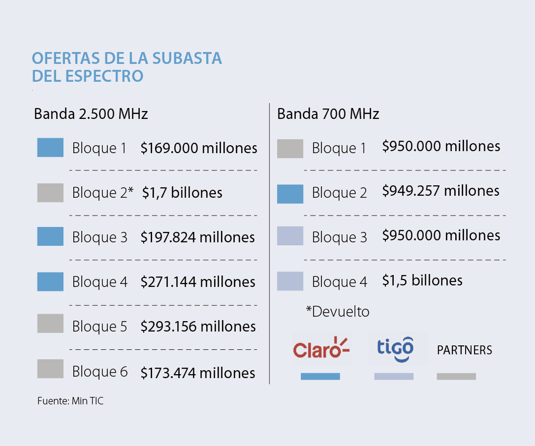Por medio de un comunicado, el Ministerio de las TIC informó que requerirá a Partners a pagar $42.000 millones por no cumplir con la oferta de $1,7 billones que había hecho por uno de los bloques de 10MHz en la banda de 2.500 MHZ, valorado en cerca de $170.000 millones.