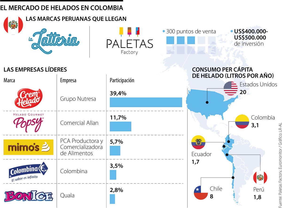 Las empresas peruanas La Lattería y Paletas Factory preparan su aterrizaje en Colombia. Se trata de dos firmas en el segmento de helados premium con especial enfoque en el estilo artesanal, que buscan incursionar en un mercado en el que el consumo per cápita de helado es de aproximadamente 3,1 litros al año. En Perú, en cambio, el consumo es de 1,8 litros, según Euromonitor.