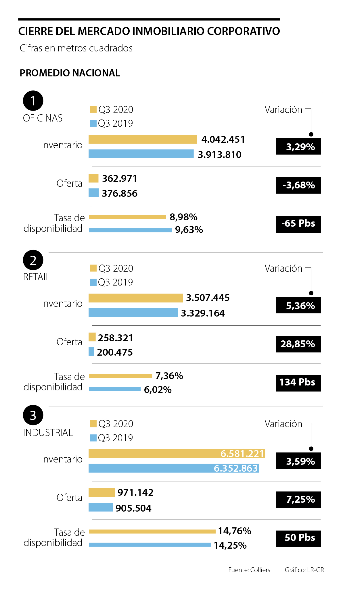Colliers International Colombia, la empresa dedicada a la prestación de servicios para este sector, reveló las cifras de inventario, oferta y tasa de disponibilidad de las principales ciudades en los sectores corporativos ya mencionados.