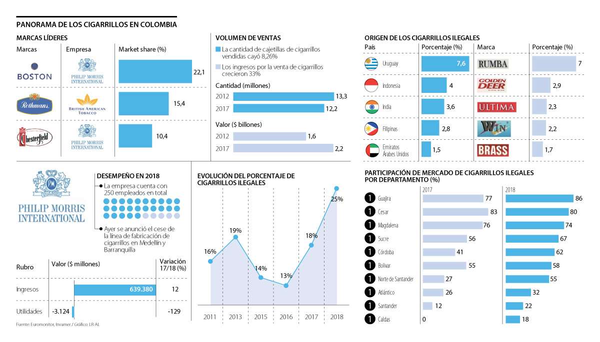 Según cifras de Euromonitor International, para 2017 se vendieron un total de 12,2 millones de cajetillas de cigarrillos en el país, cifra que tuvo una caída de 8,26% durante los últimos cinco años. Por su parte, los ingresos totales de estos productos ascendieron a $2,2 billones, total que aumentó 33% en el último lustro. Por marcas, Boston lidera el market share en el país al ocupar 22% del mercado, le sigue Rothmans de BAT con 15,4% y cierra Chesterfield, con 10,4%. La cuarta marca, que también hace parte del portafolio de PMI, es Marlboro.