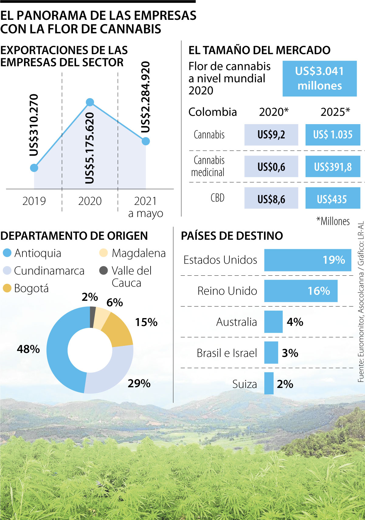 El registro de Euromonitor señala que el mercado de cannabis colombiano para 2020 fue de US$9,2 millones, US$8,6 millones representados por la categoría de CBD y el monto restante en cannabis medicinal. Para la compañía, las categorías podrían presentar un incremento de 1.035% para 2025.
