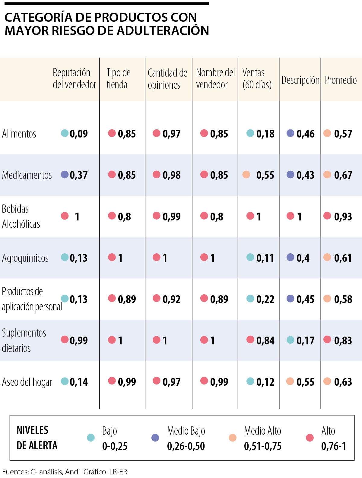 Los productos con mayor riesgo de presentar de adulteración en ventas son los medicamentos, los alimentos, las bebidas alcohólicas, los agroquímicos, los productos de aplicación personal, los suplementos dietarios y los productos de aseo para el hogar.
