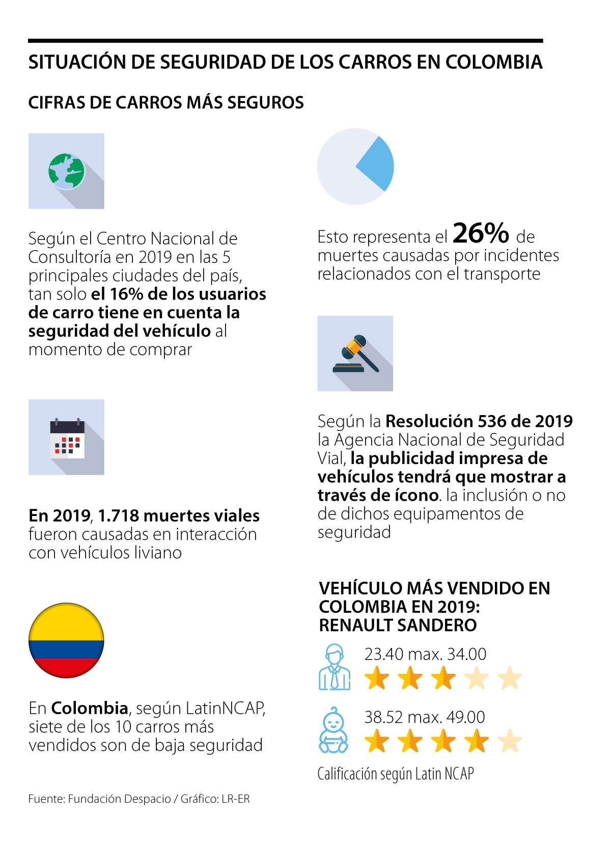 Por ejemplo, durante 2019, el vehículo más vendido en Colombia fue el Renault Sandero con 10.427 unidades, según la calificación del Latin NCAP, recibió tres estrellas en la protección para el ocupante adulto y cuatro estrellas para los niños.
