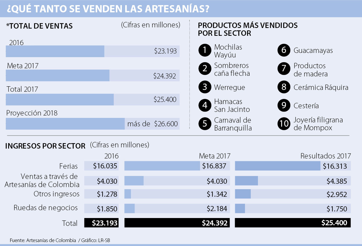 Según Artesanías de Colombia la proyección de ventas era por $24.392 millones, pero el crecimiento final fue por el nivel de 10% frente al año anterior cuando se lograron $23.193 millones. Ahora para 2018, las apuestas del sector se basan en que las ruedas de negocios crezcan en participantes y así se generen $26.670 millones en ingresos.