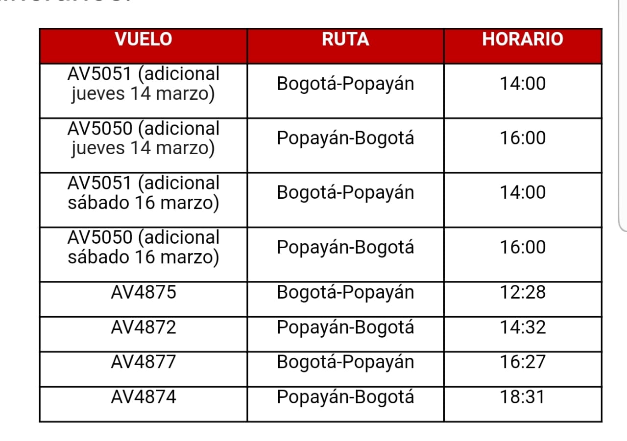 Debido a los bloqueos presentados en la vía Panamericana desde este miércoles a raíz de las protestas indígenas en el Cauca, Avianca anunció que operará dos vuelos adicionales, uno este jueves 14 de marzo y otro el sábado 16, en la ruta Bogotá-Popayán-Bogotá.