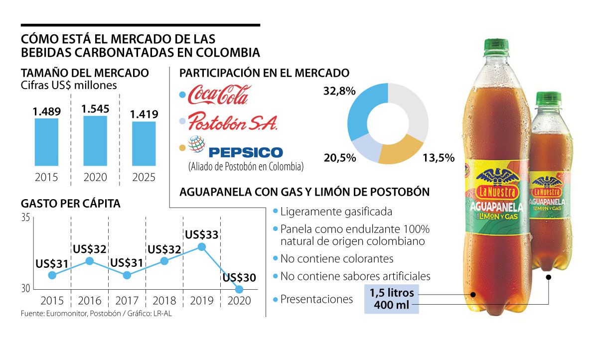El nuevo producto entra a competir al mercado de bebidas carbonatadas que, según Euromonitor, cerrará ventas este año por más de US$1.500 millones. De esta manera, el aguapanela con limón se suma a los lanzamientos que ha hecho Postobón en 2020. En febrero, la empresa lanzó Acqua, bebida ligeramente gasificada, cero calorías, endulzada con stevia y sin azúcar añadida.
