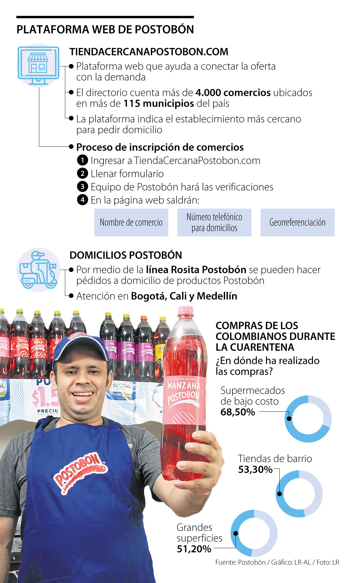 Por lo anterior, Postobón lanzó una página web que sirve como directorio para conectar la oferta con la demanda. TiendaCercanaPostobon.com es una plataforma en la cual las personas pueden encontrar la ubicación de tiendas, panaderías, supermercados y minimercados de barrio cercanos a sus residencias y los números para hacer domicilios.