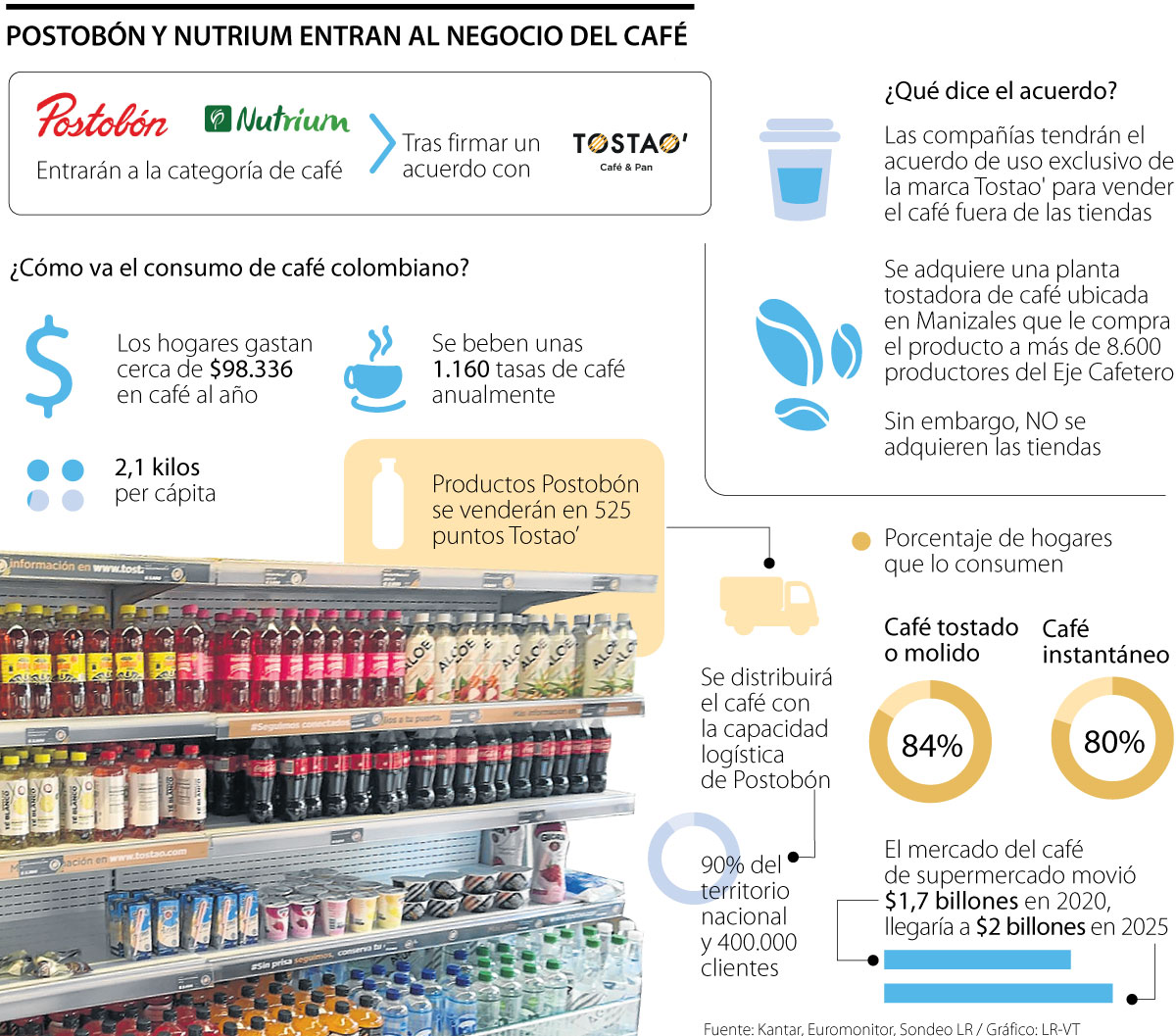 Cuando se piensa en Colombia, indudablemente, también se piensa en café, no solo porque en el año se consumen cerca 1.160 tasas en el país, sino también porque mueve cerca de $1,7 billones en su presentación para preparar. Es precisamente a ese mercado al que le apuntan Postobón y Nutrium tras su alianza con Tostao’ Café & Pan.