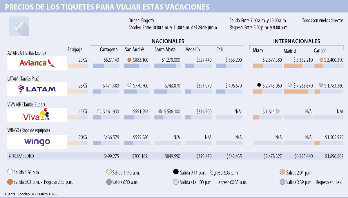 “Lo que le recomendamos a nuestros pasajeros es buscar tiquetes con uno o dos meses de anticipación para que puedan encontrar los mejores precios”, explicó Santiago Álvarez, director ejecutivo de Latam Airlines Colombia, quien agregó que en esta temporada de vacaciones “la compañía moviliza cerca de un millón de pasajeros entre julio y agosto en el país, lo que corresponde a 22% más frente a una temporada baja como abril y mayo”.