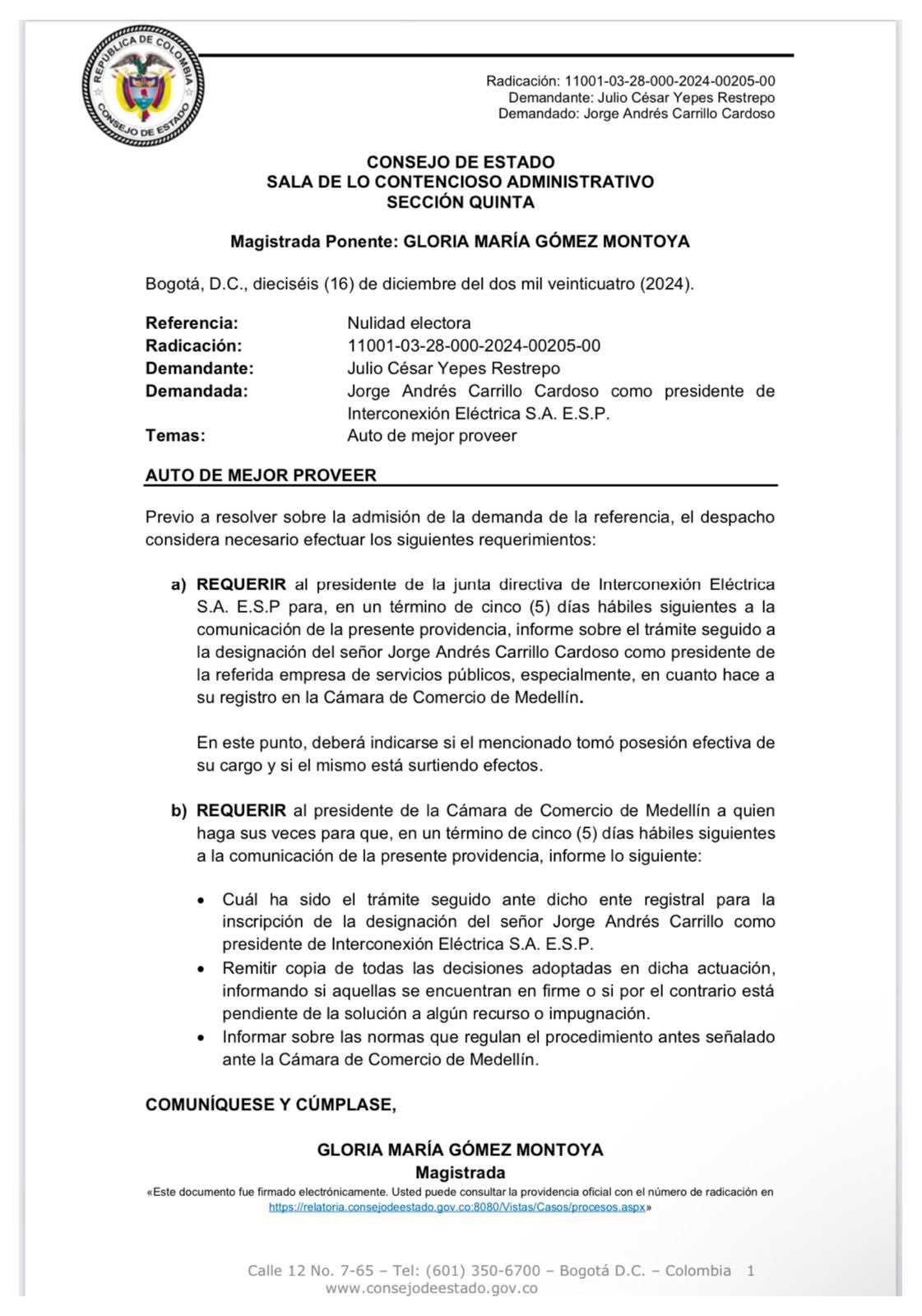 Esta última entidad también deberá en los próximos cinco días poner sobre la mesa del Consejo de Estado las pruebas del trámite que da prueba de la inscripción de Carrillo como la persona que dirigirá ISA. "Remitir copia de todas las decisiones adoptadas en dicha actuación, informando si aquellas se encuentran en firme o si por el contrario está pendiente de la solución a algún recurso o impugnación", aseguró el alto tribunal.