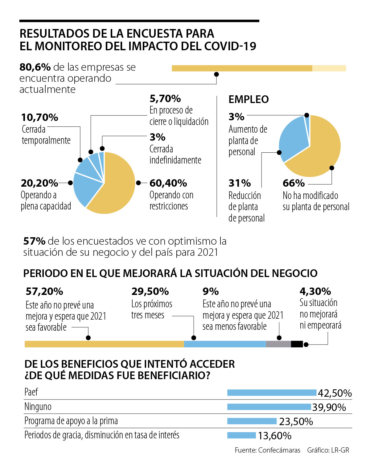 La reactivación de la economía va en buen camino para los empresarios, pues la encuesta indicó que 80,6% de las empresas se encuentra operando actualmente, la mayoría de ellas, gracias al comercio electrónico, redes sociales y comercio a domicilio. Además, 54% considera que para 2021 la situación de sus negocios va a mejorar.