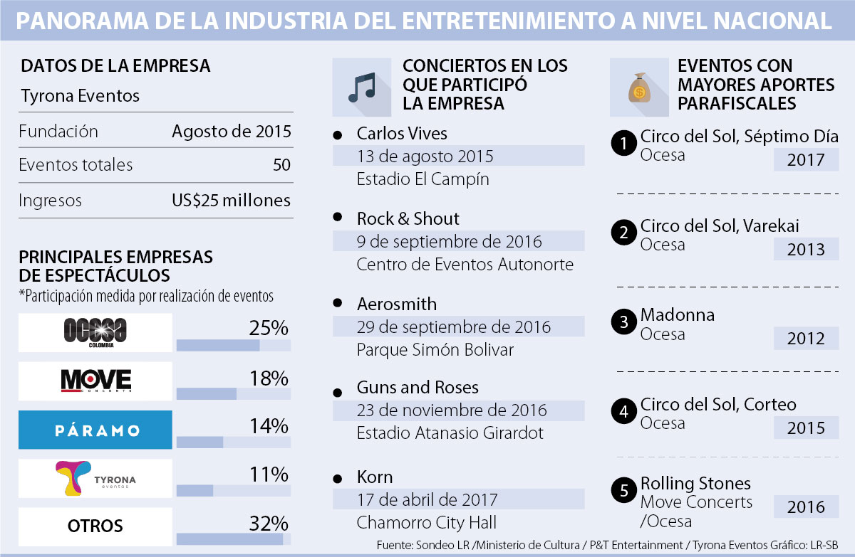 Precisamente, según reportes de P&T Entertainment, Tyrona es la cuarta con mayor participación del mercado con 11% de la realización de grandes eventos. El top tres es: Ocesa (25%), Move Concerts (18%) y Páramo (14%).