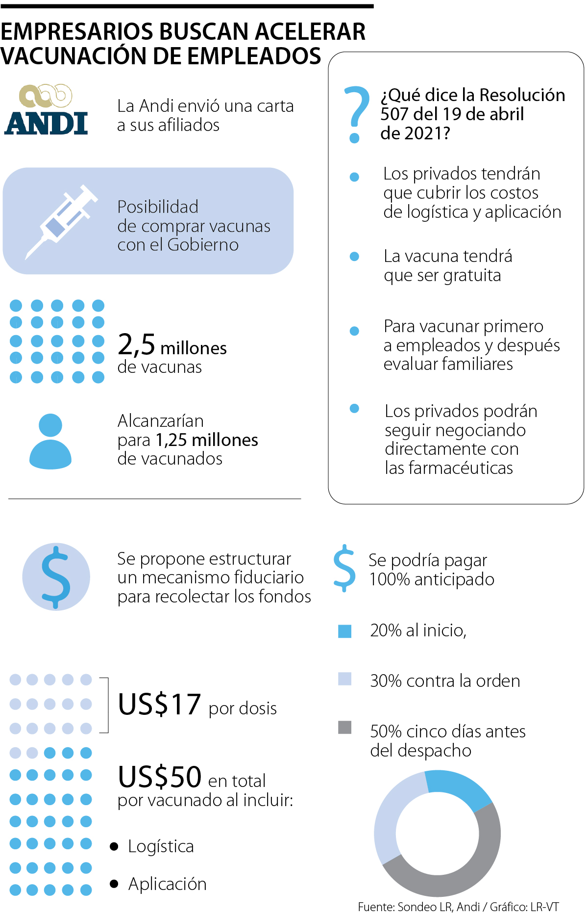 La Asociación Nacional de Empresarios de Colombia (Andi) envió una carta a sus afiliados en la que comentaba la posibilidad de que, junto con el Gobierno Nacional, se comprarán 2,5 millones de vacunas, lo que alcanzaría para inmunizar a 1,25 millones de trabajadores.
