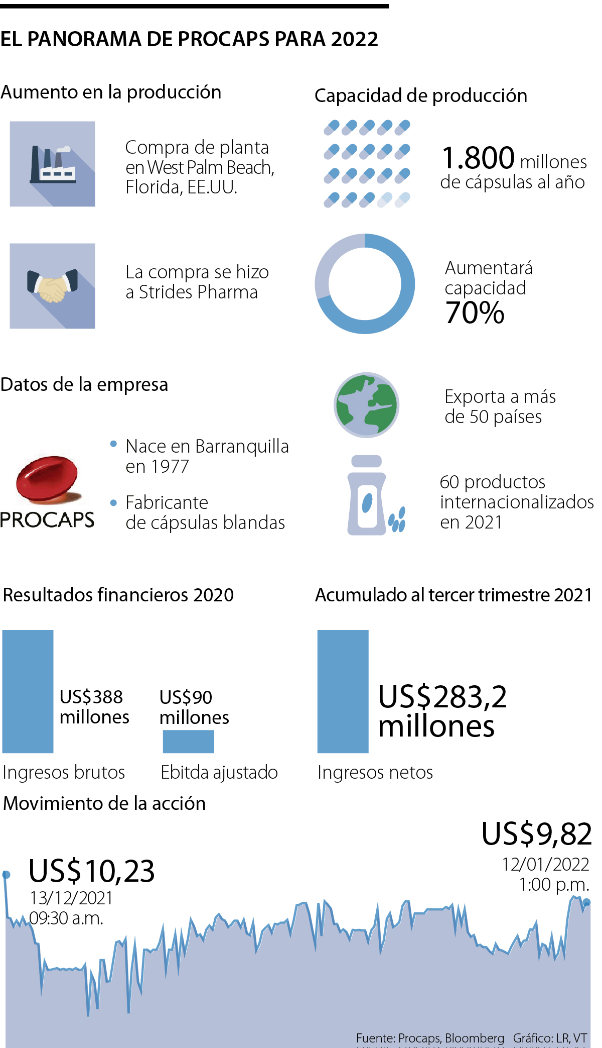 La segunda semana de 2022 inició con buenas noticias para Procaps y su plan de globalización con la compra de su nueva planta. En total, la compañía proyecta inversiones por más de US$215 millones para su crecimiento, entre las cuales no se descarta la futura adquisición de nuevas empresas de menor tamaño en la región. Asimismo, según contó Camilo Camacho, presidente de la compañía en Colombia, también se destinarán fondos para el rubro de innovación e investigación con montos de hasta US$12 millones y US$15 millones anuales.