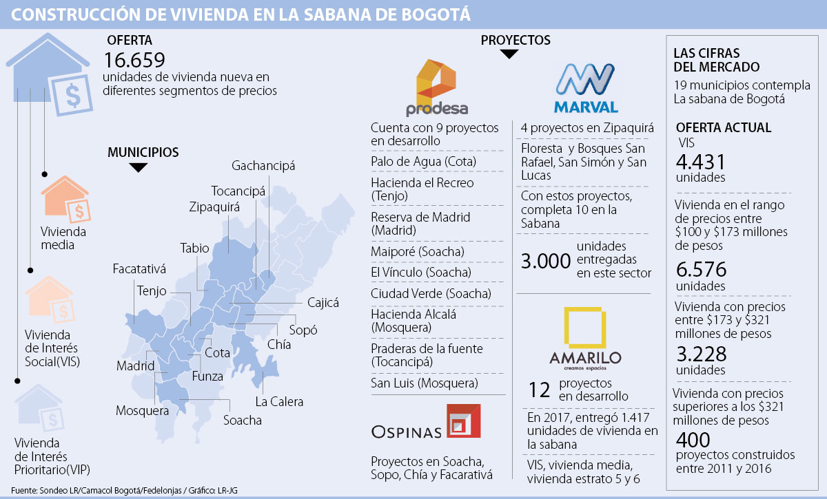 La oferta de vivienda en la sabana de Bogotá es cada vez mayor. El proceso de urbanización en los 19 municipios, que contempla esta zona de la ciudad, sigue jalonando nuevas inversiones de los desarrolladores y compradores, tanto así, que a hoy hay más de 16.600 unidades disponibles. Prodesa, Amarilo y Ospinas lideran la construcción de este alto volumen de proyectos.