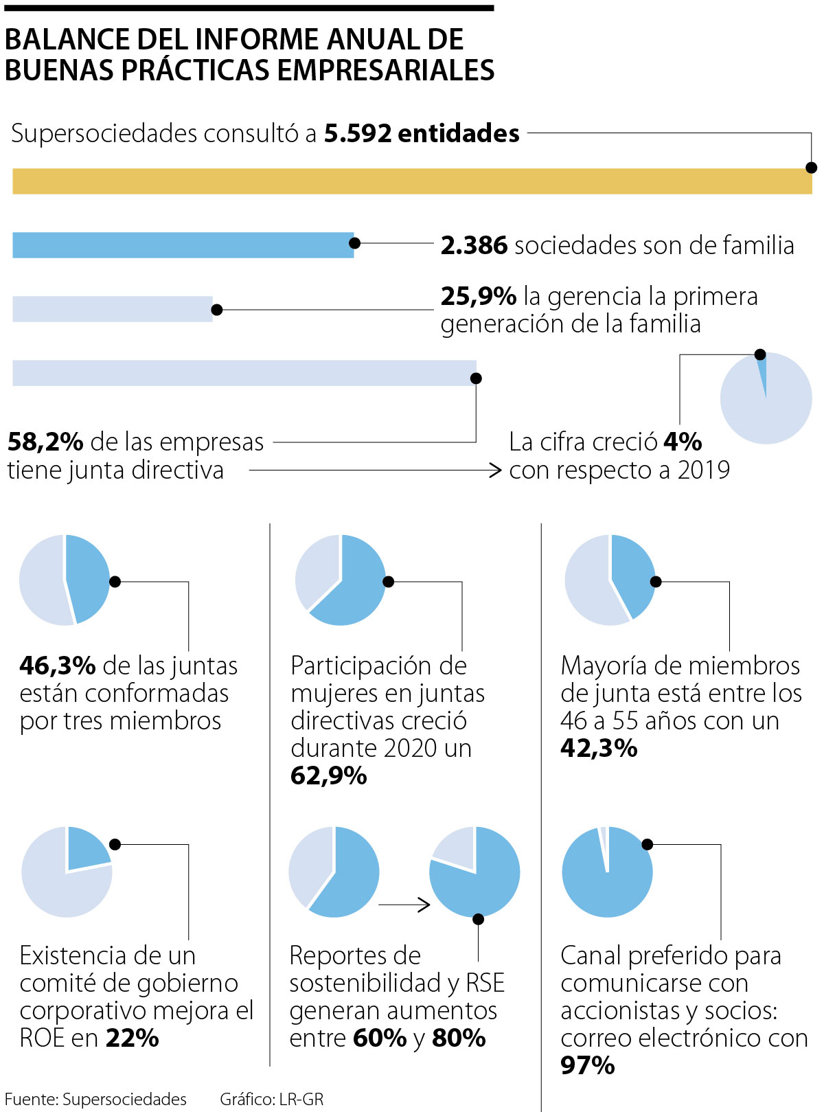 La Superintendencia de Sociedades presentó el informe de Buenas Prácticas Empresariales que permite establecer los aspectos más importantes de las empresas colombianas con relación a las prácticas de gobierno corporativo. Para ello, consultó a 5.592 sociedades en el país que reportan información no financiera a esta entidad y evidenció que 58,2% de las compañías tiene junta directiva.