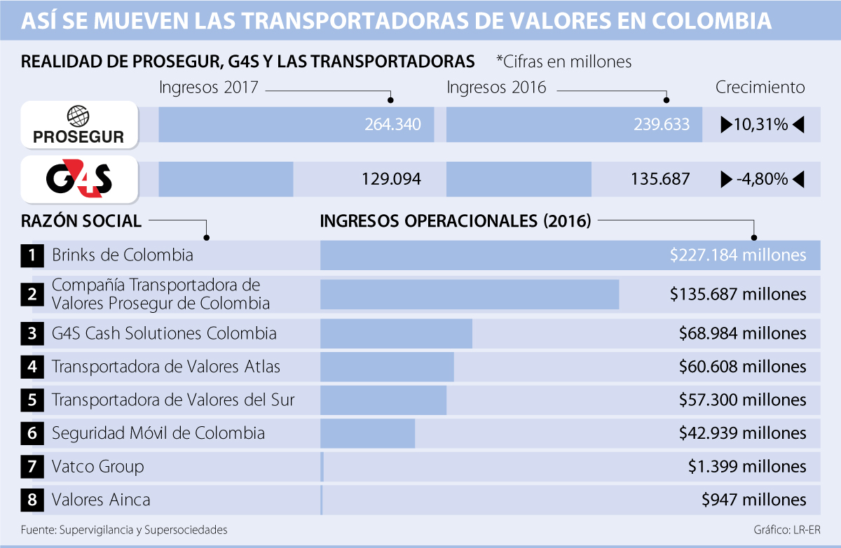 No obstante, esta cifra disminuirá a siete, al confirmarse que el negocio de transporte de valores de G4S, que actualmente se maneja bajo la razón social G4S Cash Solution, pasará a manos de otra de las organizaciones participantes en este sector: Prosegur, la cual hoy en día presta servicio de transporte de valores en 24 ciudades.