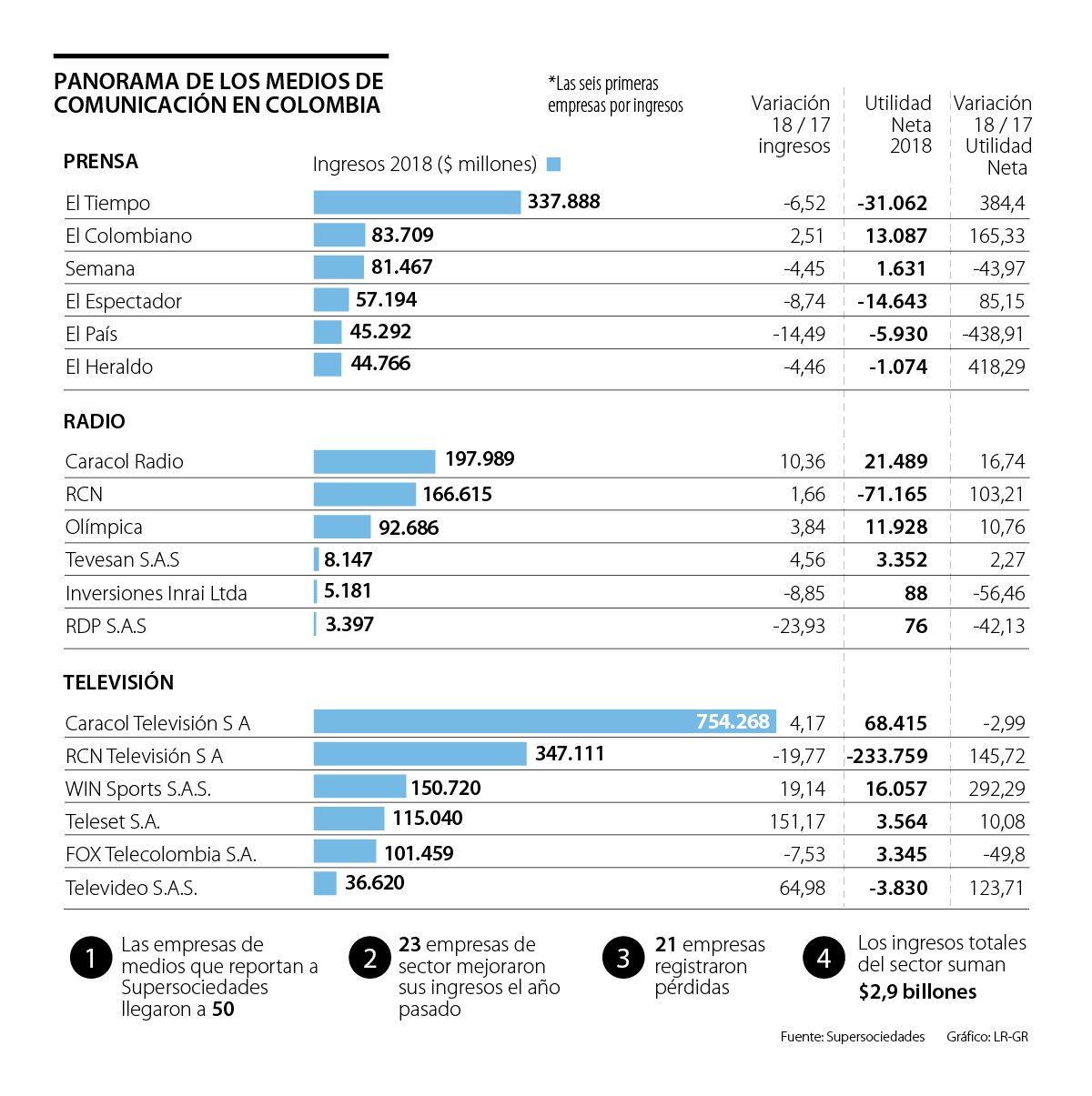 De las seis compañías que le reportan sus ingresos y resultados a la Superintendencia de Sociedades, se destaca en el informe que cuatro obtuvieron una variación positiva en materia de ingresos, dentro de las que se encuentran Caracol Radio, RCN, Olímpica y Tevesan con una facturación que suma $465.437 millones. Por otro lado Inversiones Inrai y RDP obtuvieron una variación negativa en ingresos y utilidades y lograron una facturación que suma $8.578 millones.