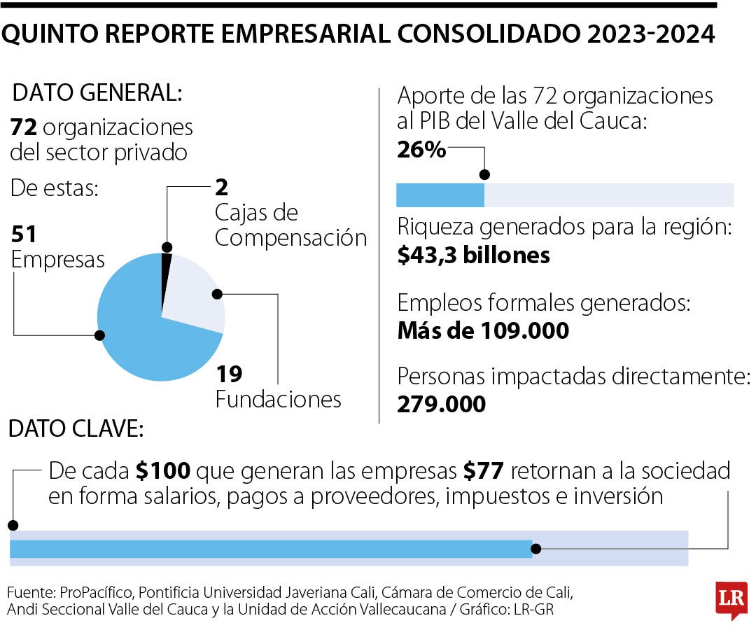 El reporte reveló que las organizaciones participantes generaron $43,3 billones en valor económico, cifra equivalente a 26% del PIB del Valle del Cauca. El reporte permite ver que de cada $100 producidos, $77 regresan a la sociedad a través de salarios, pagos a proveedores, impuestos e inversión social dirigida a comunidades, empleados y sus familias.