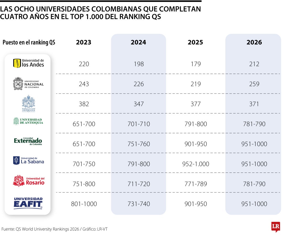El QS World University Rankings 2026 ratificó que ocho universidades colombianas se han mantenido entre las 1.000 mejores del mundo durante los últimos cuatro años, un logro importante en un contexto de creciente competencia entre instituciones de educación superior a escala global. Aunque se han registrado algunos cambios en sus posiciones, estas instituciones mantienen su presencia y reconocimiento a nivel internacional.